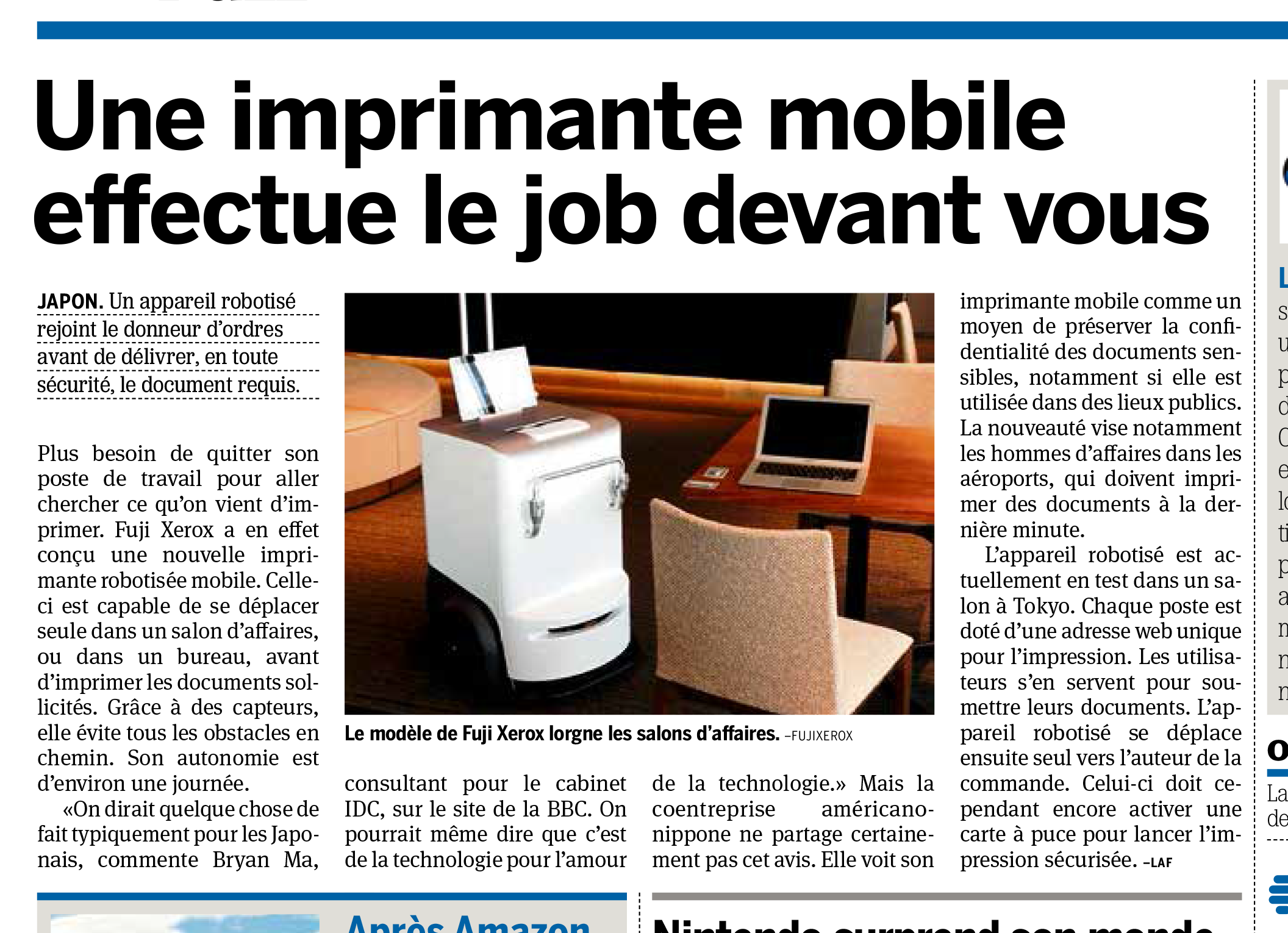 Imprimante mobileVu dans le 20 Minutes (VD), 1er septembre 2014, p. 12. Ici, c'est bien l'imprimante qui est (auto)mobile. |