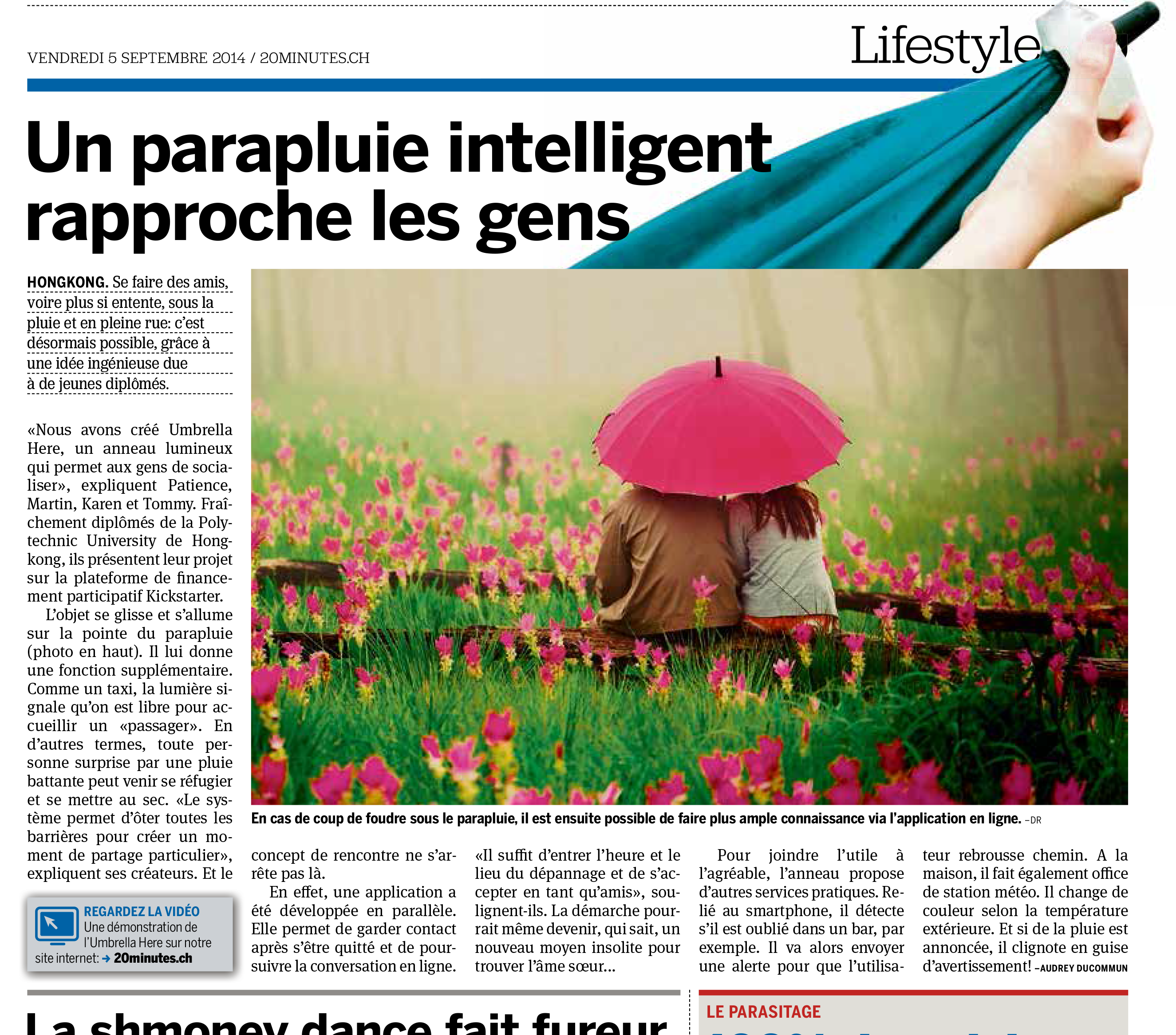 Parapluie intelligentVu dans le 20 Minutes (VD), 5 septembre 2014, p. 19. Mélange de logiciel et de matériel, un bidule qui ajoute une couche d'Internet à votre pépin. Entre pense-bête et pédibus pour adultes. |