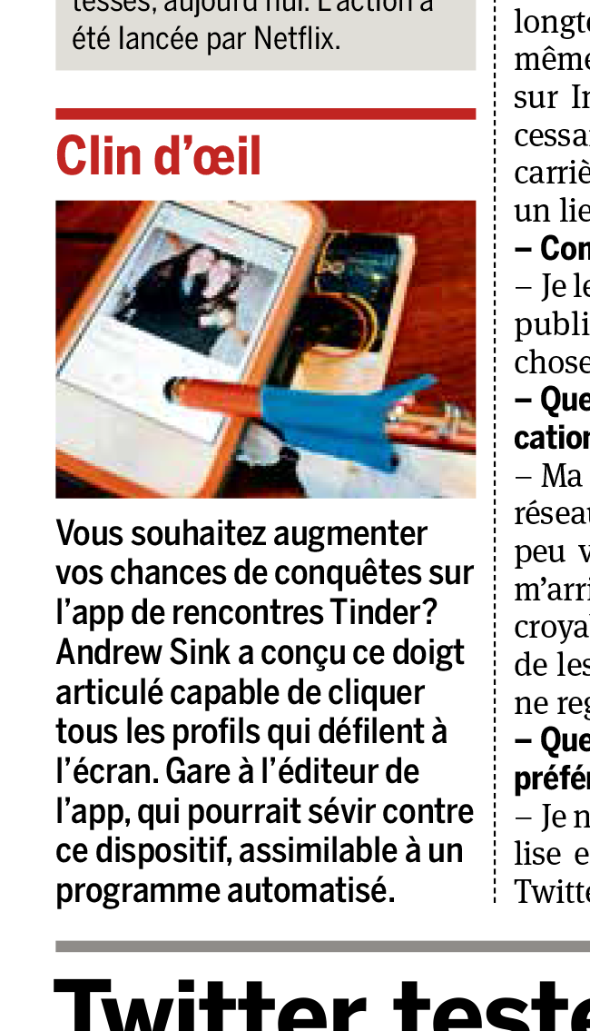 Doigt articuléVu dans le 20 Minutes (VD), 10 septembre 2014, p. 13. Un doigt articulé qui clique tout seul… de quoi gagner du temps pour certaines tâches répétitives. |