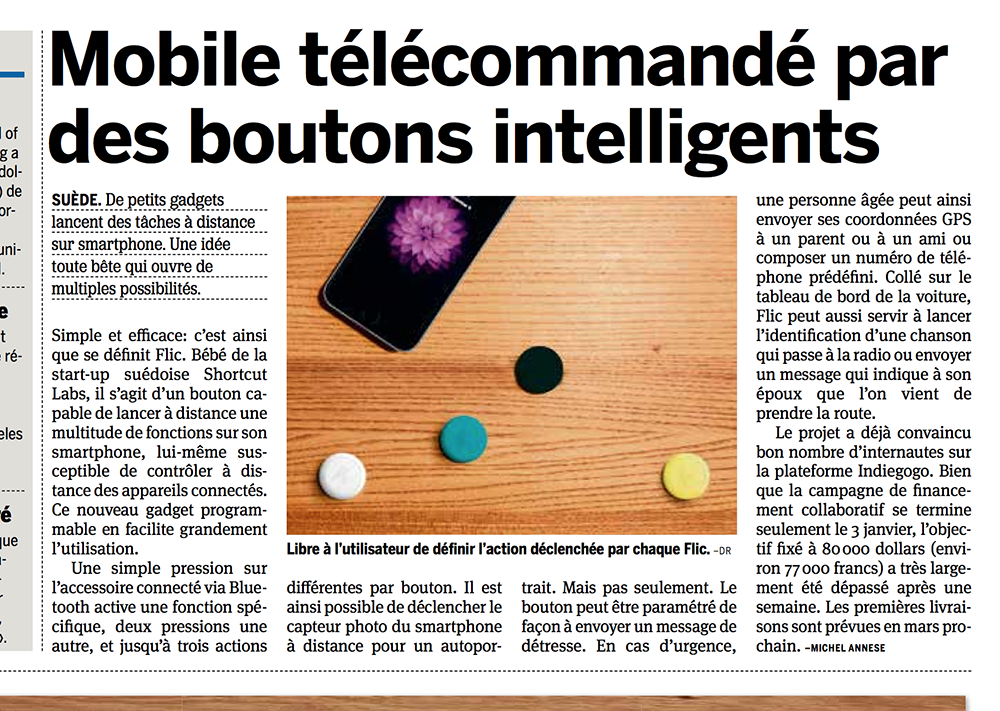 Boutons intelligentsVu dans le 20 Minutes (VD), 24 novembre 2014, p. 17. De petits interrupteurs qui peuvent déclencher chacun jusqu'à trois actions différentes (programmables !) via Bluetooth. |